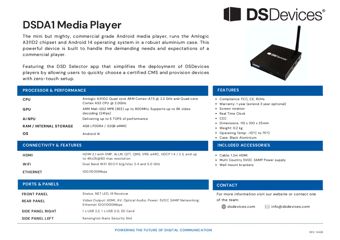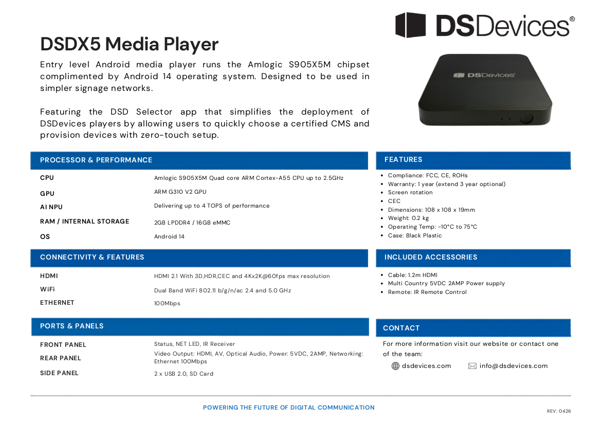The DSDevices DSCS95 is a digital signage player purpose built to run Xibo for Android and is best suited for use in simple digital signage networks.